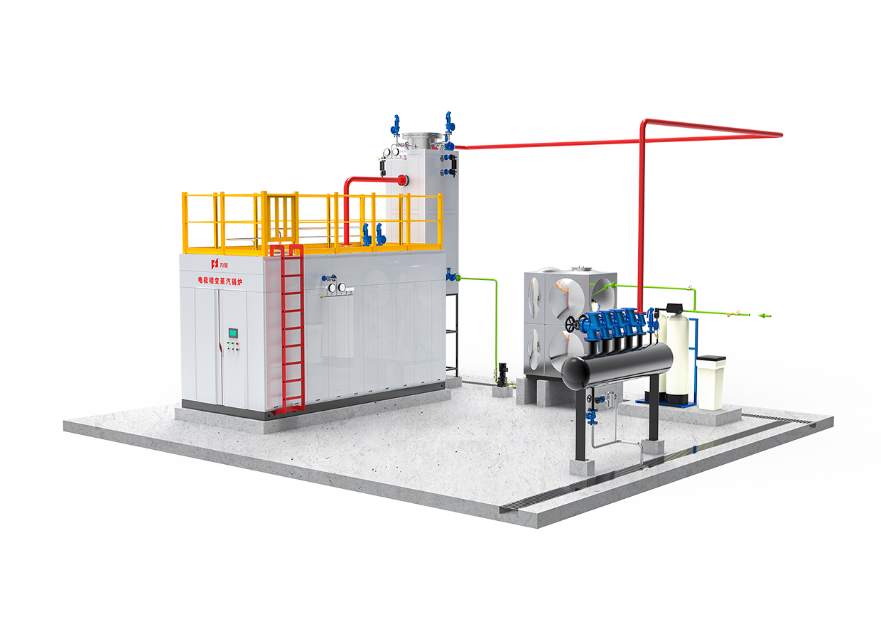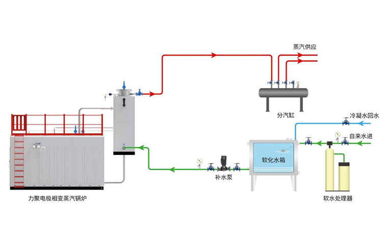 電極相變鍋爐是5001拉斯維加斯獨創的一種在鍋爐內部實現相變換熱的電極鍋爐。它主要由電極筒、介質筒、換熱器以及控制裝置組成。三相電極固定在電極筒內,浸在具有一定電導率的熱媒水中,三相電極通電后直接加熱熱媒水,在電流的作用下,熱媒水被迅速加熱汽化變成熱媒蒸汽,蒸汽上升到換熱器管外,將熱量傳遞給換熱器管內的冷水,對外輸出蒸汽。而熱媒蒸汽凝結成水滴回到熱媒水中重新被加熱汽化,完成整個循環。在機組運行中,熱媒水封閉在筒體內不斷地汽化-冷凝-汽化往復循環,實現電能向熱能的轉換。